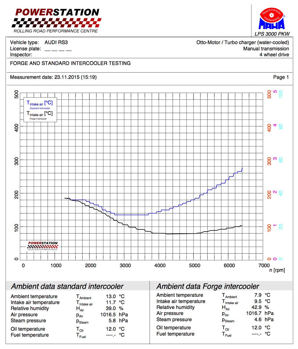 On the standard car we tested on, it made 362bhp completely stock (so largely in line with what Audi quote) with a peak intake temperature of 58°C. With just this intercooler fitted and no other modifications, the same car made 386bhp with a peak inlet temperature of 23°C, a gain of 24bhp and a drop of 35°C. Gains on mapped cars will likely be even more impressive as the stock intercooler core really starts to struggle on stage 1 mapped cars.